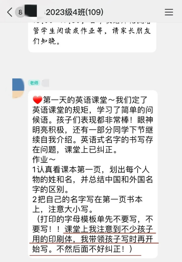 小学家长群内英语老师通知不要写印刷体(手写体)。